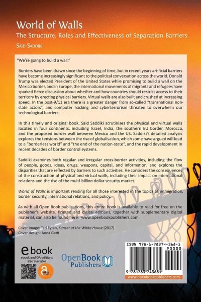"We're going to build a wall." Borders have been drawn since the beginning of time, but in recent years artificial barriers have become increasingly significant to the political conversation across the world. Donald Trump was elected President of the United States while promising to build a wall on the Mexico border, and in Europe, the international movements of migrants and refugees have sparked fierce discussion about whether and how countries should restrict access to their territory by erecting physical barriers. Virtual walls are also built and crushed at increasing speed. In the post-9/11 era there is a greater danger from so-called "transnational non-state actors", and computer hacking and cyberterrorism threaten to overwhelm our technological barriers. In this timely and original book, Said Saddiki scrutinises the physical and virtual walls located in four continents, including Israel, India, the southern EU border, Morocco, and the proposed border wall between Mexico and the US. Saddiki's detailed analysis explores the tensions between the rise of globalisation, which some have argued will lead to a "borderless world" and "the end of the nation-state", and the rapid development in recent decades of border control systems. Saddiki examines both regular and irregular cross-border activities, including the flow of people, goods, ideas, drugs, weapons, capital, and information, and explores the disparities that are reflected by barriers to such activities. He considers the consequences of the construction of physical and virtual walls, including their impact on international relations and the rise of the multi-billion dollar security market. World of Walls: The Structure, Roles and Effectiveness of Separation Barriers is important reading for all those interested in the topics of immigration, border security, international relations, and policy.