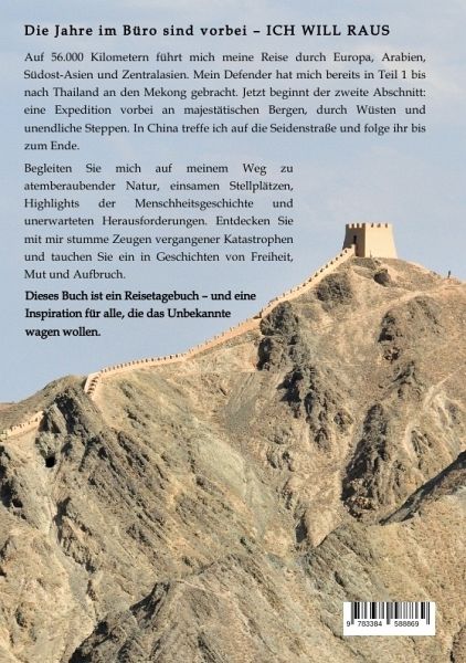 Aufbruch, raus aus dem Büro, dem Alltag entfliehen, der Routine Lebewohl sagen. Die Entscheidung es zu tun, gehört zu den bedeutendsten Entscheidung in meinem Leben. Auf über 56.000 Kilometern führt mich meine Reise durch Europa, Arabien, Südost-Asien, China und Zentralasien - vom vertrauten Zuhause bis zu den fernen Ländern entlang der Seidenstraße. Mein betagter Begleiter hat mich in Teil eins bereits bis nach Thailand an den Mekong gebracht - jetzt beginnt der zweite Teil: eine Expedition durch Wüsten, unendliche Steppen und majestätische Berge. Begleiten Sie mich auf meinem Weg zu atemberaubender Natur, einsamen Stellplätzen, kulturellen Highlights der Menschheitsgeschichte und unerwarteten Herausforderungen. Besuchen Sie mit mir die stummen Zeugen vergangener Katastrophen und tauchen Sie ein in Geschichten von Freiheit, Mut und Aufbruch.Dieses Buch ist ein Reisetagebuch - und eine Inspiration für alle, die das Unbekannte wagen wollen.