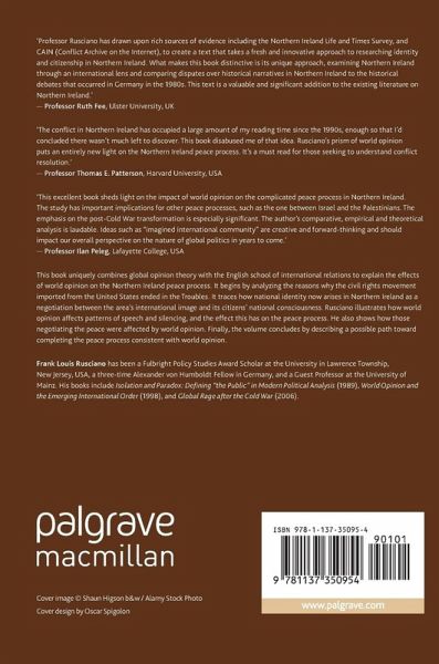 This book uniquely combines global opinion theory with the English school of international relations to explain the effects of world opinion on the Northern Ireland peace process. It begins by analyzing the reasons why the civil rights movement imported from the United States ended in the Troubles. It traces how national identity now arises in Northern Ireland as a negotiation between the area's international image and its citizens' national consciousness. Rusciano illustrates how world opinion affects patterns of speech and silencing, and the effect this has on the peace process. He also shows how those negotiating the peace were affected by world opinion. Finally, the volume concludes by describing a possible path toward completing the peace process consistent with world opinion.