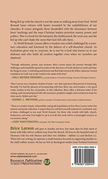 Being fed up with the church is not the same as walking away from God. World Remade bears witness with hearts wounded by the unfaithfulness of our churches. It comes alongside those dissatisfied with the dissonance between Jesus' teachings and the ways Christian leaders prioritize money, power, and politics. This is a book for the betrayed, the disillusioned, the worn out, and the fed up who can't shake the sense that God still calls them. In World Remade, Larson offers a window into a faith challenged by a seminary education and fractured by the failures of a self-absorbed church. As frustration gives way to cynicism, he is met by a God who knows us in our darkness and who holds all creation together even when we ourselves are shattered.