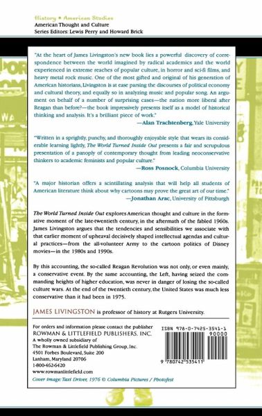Written in a sprightly, punchy, and thoroughly enjoyable style that wears its considerable learning lightly, The World Turned Inside Out presents a fair and scrupulous presentation of a panoply of contemporary thought from leading neoconservative thinkers to academic feminists and popular culture. -- Ross Posnock, Columbia University At the heart of James Livingston's new book lies a powerful discovery of correspondence between the world imagined by radical academics and the world experienced in extreme reaches of popular culture, in horror and sci-fi films, and heavy metal rock music. One of the most gifted and original of his generation of American historians, Livingston is at ease parsing the discourses of political economy and cultural theory, and equally so in analyzing music and popular song. An argument on behalf of a number of surprising cases-the nation more liberal after Reagan than before?-the book impressively presents itself as a model of historical thinking and analysis. It's a brilliant piece of work. -- Alan Trachtenberg, Yale University Livingston presents a stunning display of scholarly discourse, drawing provocative conclusions about where America has been and where it might be going. Booklist How refreshing that a distinguished intellectual historian has chosen to emphasize popular culture! ... Moving beyond the hackneyed arguments between 'sixtophobes' and 'sixtophiles,' the author argues cogently that what once had been a feminist slogan-the personal is the political-became the enduring legacy of the late-20th-century cultural revolution. Highly recommended. CHOICE A major historian offers a scintillating analysis that will help all students of American literature think about why cartoons may prove the great art of our time. -- Jonathan Arac, University of Pittsburgh If you pick up this book, you will not be bored. And you certainly will not stop arguing. History News Network To people like myself who came of age during the sixties, the period that followed seemed like a gray epilogue to that colorful decade. But Jim Livingston's book, The World Turned Inside Out, has convinced me otherwise. It's one of the first things I have read that really makes sense of the cultural and political changes of the last forty years-and does so in a vivid, energetic prose. I recommend it to anyone interested in what we Americans are all about. -- John B. Judis, senior editor, The New Republic