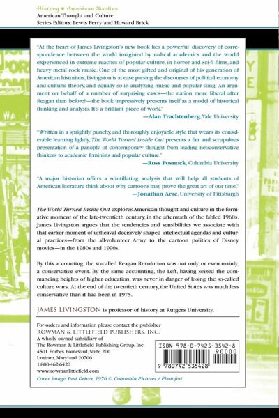 Written in a sprightly, punchy, and thoroughly enjoyable style that wears its considerable learning lightly, The World Turned Inside Out presents a fair and scrupulous presentation of a panoply of contemporary thought from leading neoconservative thinkers to academic feminists and popular culture. -- Ross Posnock, Columbia University At the heart of James Livingston's new book lies a powerful discovery of correspondence between the world imagined by radical academics and the world experienced in extreme reaches of popular culture, in horror and sci-fi films, and heavy metal rock music. One of the most gifted and original of his generation of American historians, Livingston is at ease parsing the discourses of political economy and cultural theory, and equally so in analyzing music and popular song. An argument on behalf of a number of surprising cases-the nation more liberal after Reagan than before?-the book impressively presents itself as a model of historical thinking and analysis. It's a brilliant piece of work. -- Alan Trachtenberg, Yale University Livingston presents a stunning display of scholarly discourse, drawing provocative conclusions about where America has been and where it might be going. Booklist How refreshing that a distinguished intellectual historian has chosen to emphasize popular culture! ... Moving beyond the hackneyed arguments between 'sixtophobes' and 'sixtophiles,' the author argues cogently that what once had been a feminist slogan-the personal is the political-became the enduring legacy of the late-20th-century cultural revolution. Highly recommended. CHOICE A major historian offers a scintillating analysis that will help all students of American literature think about why cartoons may prove the great art of our time. -- Jonathan Arac, University of Pittsburgh If you pick up this book, you will not be bored. And you certainly will not stop arguing. History News Network To people like myself who came of age during the sixties, the period that followed seemed like a gray epilogue to that colorful decade. But Jim Livingston's book, The World Turned Inside Out, has convinced me otherwise. It's one of the first things I have read that really makes sense of the cultural and political changes of the last forty years-and does so in a vivid, energetic prose. I recommend it to anyone interested in what we Americans are all about. -- John B. Judis, senior editor, The New Republic