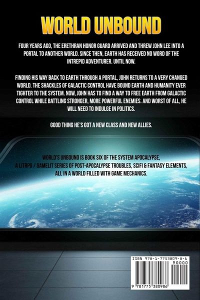 Four years ago, the Erethran Honor Guard arrived and threw John Lee into a Portal to another world. Since then, Earth has received no word of the intrepid adventurer. Until now.Finding his way back to Earth through a Portal, John returns to a very changed world. The shackles of Galactic control have bound Earth and humanity ever tighter to the System. Now, John has to find a way to free Earth from Galactic control while battling stronger, more powerful enemies. And worst of all, he will need to indulge in politics.Good thing he's got a new Class and new allies.World's Unbound is book six of the System Apocalypse, a LitRPG / GameLit series of post-apocalypse troubles, scifi & fantasy elements, all in a world filled with game mechanics. This series contains elements of games like level ups, experience, enchanted materials, a sarcastic spirit, mecha, a beguiling dark elf, monsters, minotaurs, a fiery red head and a semi-realistic view on violence and its effects. Does not include harems.