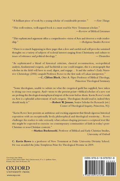 For almost 300 years, the dominant trend in New Testament interpretation has been to read the Acts of the Apostles as a document that argues for the political possibility of harmonious co-existence between 'Rome' and the early Christian movement. Kavin Rowe argues that the time is long overdue for a sophisticated, critically constructive reappraisal. "A brilliant piece of work by a young scholar of considerable promise." --First Things "This well-written, well-argued book is a must read for New Testament scholars." -- Review of Biblical Literature "This sophisticated argument offers a comprehensive vision of Acts and deserves a wide readership." -- Religious Studies Review "There is so much happening in these pages that a slow and careful read will provoke sustained thoughts on a variety of subjects of ecclesial interest ranging from Christianity and culture to issues of tolerance and political theology." -- Themelios