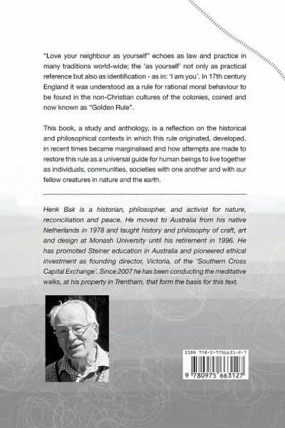 "Love your neighbour as yourself" resonates as law and practice in many if not all traditions world-wide, not only as (abstract) 'measure' but also as (existential) identification. It was coined as "Golden Rule" for human behaviour in 17th century England, symptomatic of the new consciousness of the time, conceptually and globally, enlightenment and colonialism. This book, a study and anthology, is a reflection on the historical and philosophical contexts in which this 'rule' originated, developed, in recent times became marginalised and how attempts are made to restore this rule as a universal guide for human beings to live together as individuals, communities, societies with one another and with our fellow creatures in nature and the earth. Henk Bak is a historian, philosopher, and activist for nature, reconciliation and peace. He moved to Australia from his native Netherlands in 1978 and taught history and philosophy of craft, art and design at Monash University until his retirement in 1996. He has promoted Steiner education in Australia and pioneered ethical investment as founding director, Victoria, of the 'Southern Cross Capital Exchange'. Since 2007 he has been conducting the meditative walks, at his property in Trentham, that form the basis for this text.