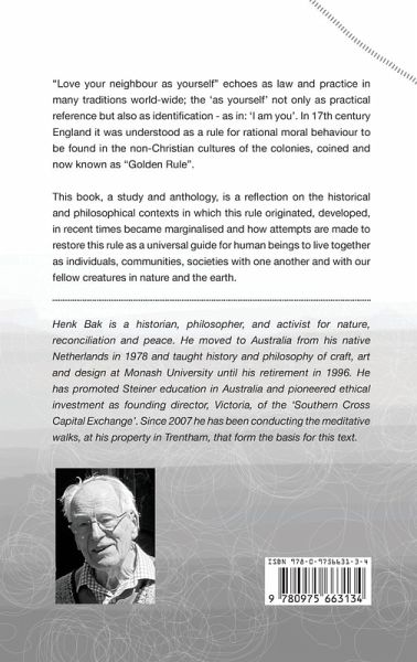 "Love your neighbour as yourself" resonates as law and practice in many if not all traditions world-wide, not only as (abstract) 'measure' but also as (existential) identification. It was coined as "Golden Rule" for human behaviour in 17th century England, symptomatic of the new consciousness of the time, conceptually and globally, enlightenment and colonialism. This book, a study and anthology, is a reflection on the historical and philosophical contexts in which this 'rule' originated, developed, in recent times became marginalised and how attempts are made to restore this rule as a universal guide for human beings to live together as individuals, communities, societies with one another and with our fellow creatures in nature and the earth. Henk Bak is a historian, philosopher, and activist for nature, reconciliation and peace. He moved to Australia from his native Netherlands in 1978 and taught history and philosophy of craft, art and design at Monash University until his retirement in 1996. He has promoted Steiner education in Australia and pioneered ethical investment as founding director, Victoria, of the 'Southern Cross Capital Exchange'. Since 2007 he has been conducting the meditative walks, at his property in Trentham, that form the basis for this text.