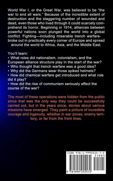 World War I, or the Great War, was believed to be "the war to end all wars." Because of the incredible extent of destruction and the staggering number of wounded and dead, even those who lived through it could scarcely comprehend its horror. Beginning in 1914, alliances between powerful nations soon plunged the world into a global conflict. Fighting-including miserable trench warfare-broke out in practically every corner of Europe and spread around the world to Africa, Asia, and the Middle East. You'll learn:What roles did nationalism, colonialism, and the European alliance structure play in the start of the war? Who thought that trench warfare was a good idea? Why did the Germans wear those spiked helmets? How did chemical warfare get introduced and what role did it play? How did the rise of communism seriously affect the course of the war? The most of these operations were hidden from the public since that was the only way they could be successfully carried out, but in the years since, stories about various missions have emerged. They paint a picture of incredible courage and ingenuity, whether in war zones, enemy territory, or far from the front lines.