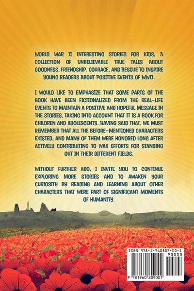 First - This book does not give any content about torture & distortion stories, kidnapping, burn, or any negative events that had a relationship with killing, it's just for children who are dreamers, who want to benefit from the positive experiences of the war. This book is a collection of stories based on real-life events during World War II. A selection of 10 inspiring stories, introduces us to unique characters with different characteristics. You will read about different kinds of stories. Animals: from - Rip - the dog that has managed to locate and rescue at least 100 victims of the air raids To Gustav one of the British royal air force coastal command carrier pigeons. Civilians: from - Adolphe Kaminsky - the young hero who has not yet reached the age of 17 when he decided to dedicate himself to forging documents to save lives during the Nazi's invasion of Northern France. To more daring characters men and women who risked their lives in a war zone to save others. Knowing what these characters lived through helps us and the children reflect on the actions of our ancestors, especially during hard and stressful times like World War II. It helps us realize what humans are truly capable of. I am passionate about children's literature and teaching them the importance of our world history, to further these lessons, I have chosen ten short stories that describe situations that revolve around values such as empathy, solidarity, friendship, and courage. I share these stories in hopes that they will inspire young readers and show them that positive lessons can be taught, even during a destructive war. That is what history is all about - learning from the past and a willingness to use past events as references to build a better future. It allows us to be better prepared to face the challenges that life throws at us. Whether the inspiring stories of Bravery, Battles, discovering history, or just World War II facts are your thing, you're sure to find something here that will keep you interested and turning the pages. So, open this book and your mind and see other things that you may not know existed.
