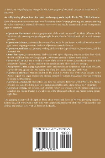 "A brisk and compelling game changer for the historiography of the Pacific Theater in World War II." – Reviewer An enlightening glimpse into nine battles and campaigns during the Pacific War Allied offensive. Each of these momentous operations were fascinating feats of strategy, planning, and bravery, handing the Allies what would eventually become a victory over the Pacific Theater and an end to Imperialist Japanese expansion.Operation Watchtower, a riveting exploration of the spark that set off the Allied offensive in the Pacific islands, detailing the grueling struggle for the island of Guadalcanal and its vital strategic position. Operation Galvanic, an incredible account of the battle for the Tarawa Atoll and base that would give them a steppingstone into the heart of Japanese-controlled waters. Operation Backhander, a gripping retelling of the war for Cape Gloucester, New Guinea, and the Bismarck Sea. Battle for Saipan, Marines stormed the beaches with a goal of gaining a crucial air base from which the US could launch its new long-range B-29 bombers directly at Japan's home islands. Invasion of Tinian, is the incredible account of the assault on Tinian. Located just under six miles southwest of Saipan. This was the first use of napalm and the "shore to shore" concept. Recapture of Guam, a gripping narrative about the liberation of the Japanese-held island of Guam, captured by the Japanese in 1941 during one of the first Pacific campaigns of the War. Operation Stalemate, Marines landed on the island of Peleliu, one of the Palau Islands in the Pacific, as part of a larger operation to provide support for General MacArthur, who was preparing to invade the Philippines. Operation Detachment, the battle of Iwo Jima was a major offensive in World War II. The Marine invasion was tasked with the mission of capturing airfields on the island for use by P-51 fighters. Operation Iceberg, the invasion and ultimate victory on Okinawa was the largest amphibious assault in the Pacific Theater. It was also one of the bloodiest battles in the Pacific, lasting ninety-eight days. This gripping narrative sheds light on these often-overlooked facets of WWII, providing students, history fans, and World War II buffs alike with a captivating breakdown of the history and combat that defined the ultimate victory of US forces in the Pacific.