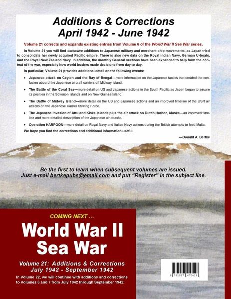 Volume 21 contains additions and corrections to existing entries from Volume 6 of the World War II Sea War series. In Volume 21 you will find extensive additions to Japanese military and merchant ship movements, as Japan tried to consolidate her newly acquired Pacific empire. There is also new data on the Royal Indian Navy, German U-boats, and the Royal New Zealand Navy. In addition, the monthly General sections have been expanded to help form the context of the war, especially how world leaders made decisions from day to day. In particular, Volume 21 provides additional detail on the following events: Japanese attack on Ceylon and the Bay of Bengal-more information on the Japanese tactics that created the confusion aboard the Japanese aircraft carriers off Midway Island. The Battle of the Coral Sea-more detail on US and Japanese actions in the South Pacific as Japan began to secure its position in the Solomon Islands and on New Guinea Island. The Battle of Midway Island-more detail on the US and Japanese actions and an improved timeline of the USN air attacks on the Japanese Carrier Striking Force. The Japanese Invasion of Attu and Kiska Islands plus the air attack on Dutch Harbor, Alaska-an improved timeline and more detailed description of the Japanese air attacks. Operation HARPOON-more detail on Royal Navy and Italian Navy actions during the British attempts to feed Malta.