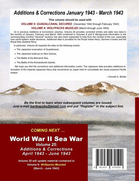 Volume 24 provides additions and corrections for January-March 1943 in the "World War II Sea War" series. It is designed to be used with: "Volume 8: Guadalcanal Secured" (December 1942 -February 1943) and "Volume 9: Wolfpacks Muzzled" (March - June 1943). Highlights for this volume include: EUROPEAN THEATRE (ETO): Updates on German U-boats. CHINA, BURMA AND INDIA THEATRE (CBI): Updates for Royal Indian Navy PACIFIC THEATRE (PTO): Updates on the Japanese evacuation of Guadalcanal, US movement to the Russell Islands, the Japanese build up on New Guinea, the Battle of the Bismarck Sea, and the Battle of the Komandorski Islands.