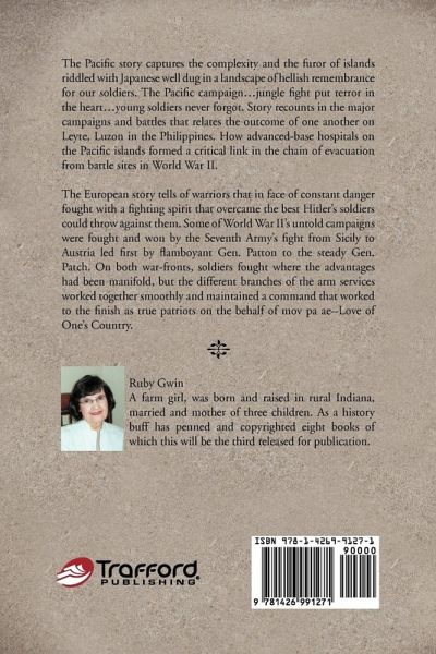 The Pacific story captures the complexity and the furor of islands riddled with Japanese well dug in a landscape of hellish remembrance for our soldiers. The Pacific campaign...jungle fight put terror in the heart...young soldiers never forgot. Story recounts in the major campaigns and battles that relates the outcome of one another on Leyte, Luzon in the Philippines. How advanced-base hospitals on the Pacific islands formed a critical link in the chain of evacuation from battle sites in World War II. The European story tells of warriors that in face of constant danger fought with a fighting spirit that overcame the best Hitler's soldiers could throw against them. Some of World War II's untold campaigns were fought and won by the Seventh Army's fight from Sicily to Austria led first by flamboyant Gen. Patton to the steady Gen. Patch. On both war-fronts, soldiers fought where the advantages had been manifold, but the different branches of the arm services worked together smoothly and maintained a command that worked to the finish as true patriots on the behalf of mov pa ae--Love of One's Country.