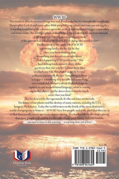 WW III The mention of such an event brings fear and dread to the hearts of people the world over. The prophet Ezekiel and many other Bible prophets saw a great end-time war taking place. A war that would burn like a furnace upon the earth. A war that would trigger many other end-time events. The Bible prophets of the Old and New Testaments and Jesus himself, speak together in harmony warning our generation of the approach of a nuclear fire war that will change the world forever! The drumbeat of the approach of WW III is growing louder day by day by day.Have you been thinking that something just doesn't seem right about? What is happening in the world today? This hard-hitting book answers many of the questions that you may have about these days in which you live. This planet seems to be on a collision course with disaster. Something is about to happen, something very terrible and something very wonderful. Author Gabriel Michaels helps to explain, in easy to understand language, what is coming upon this planet; and he shows how it may be much sooner than you think! The book is not for the squeamish. It's the end-times on steroids. The future of our planet and the destiny of many nations, including the USA, hangs in the balance. Today the world teeters on the brink of the most destructive, world-changing war in history—WW III! Very few people realize the peril that they are in or that there is only one escape from what is coming. This book could be the final warning that many people will receive. For the sake of you, your family, and your friends, you need to listen to this warning—a warning done out of love!