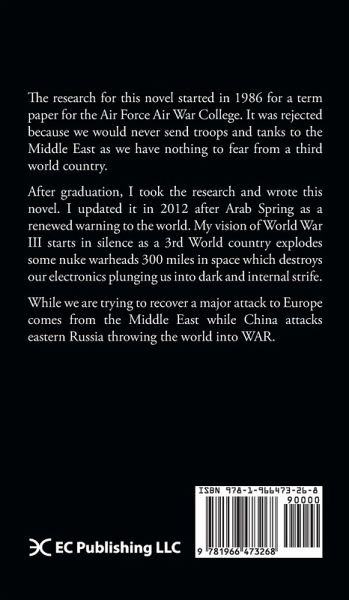 The research for this novel started in 1986 for a term paper for the Air Force Air War College. It was rejected because we would never send troops and tanks to the Middle East as we have nothing to fear from a third world country.After graduation, I took the research and wrote this novel. I updated it in 2012 after Arab Spring as a renewed warning to the world. My vision of World War III starts in silence as a 3rd World country explodes some nuke warheads 300 miles in space which destroys our electronics plunging us into dark and internal strife. While we are trying to recover a major attack to Europe comes from the Middle East while China attacks eastern Russia throwing the world into WAR.