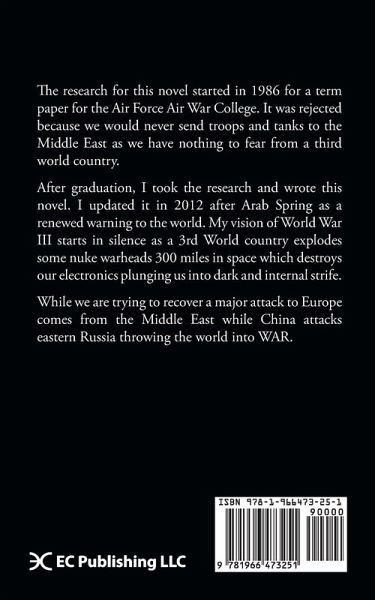 The research for this novel started in 1986 for a term paper for the Air Force Air War College. It was rejected because we would never send troops and tanks to the Middle East as we have nothing to fear from a third world country.After graduation, I took the research and wrote this novel. I updated it in 2012 after Arab Spring as a renewed warning to the world. My vision of World War III starts in silence as a 3rd World country explodes some nuke warheads 300 miles in space which destroys our electronics plunging us into dark and internal strife.While we are trying to recover a major attack to Europe comes from the Middle East while China attacks eastern Russia throwing the world into WAR.