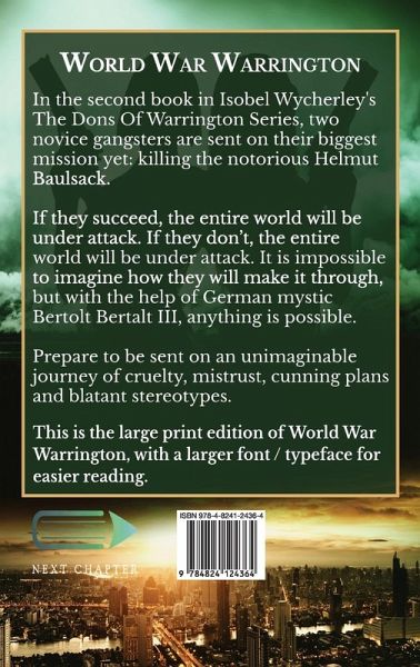 In the second book in Isobel Wycherley's The Dons Of Warrington Series, two novice gangsters are sent on their biggest mission yet: killing the notorious Helmut Baulsack. If they succeed, the entire world will be under attack. If they don't, the entire world will be under attack. It is impossible to imagine how they will make it through, but with the help of German mystic Bertolt Bertalt III, anything is possible. Prepare to be sent on an unimaginable journey of cruelty, mistrust, cunning plans and blatant stereotypes. This is the large print edition of World War Warrington, with a larger font / typeface for easier reading.