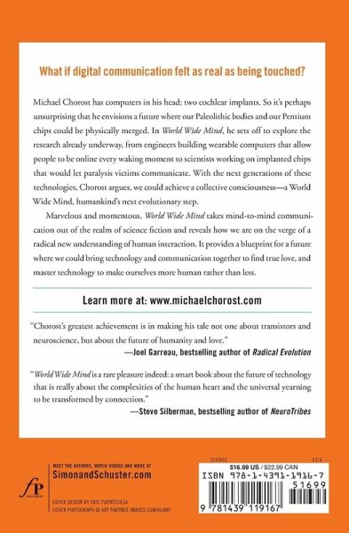 What if digital communication felt as real as being touched? This question led Michael Chorost to explore profound new ideas triggered by lab research around the world, and the result is the book you now hold. Marvelous and momentous, World Wide Mind takes mind-to-mind communication out of the realm of science fiction and reveals how we are on the verge of a radical new understanding of human interaction. Chorost himself has computers in his head that enable him to hear: two cochlear implants. Drawing on that experience, he proposes that our Paleolithic bodies and our Pentium chips could be physically merged, and he explores the technologies that could do it. He visits engineers building wearable computers that allow people to be online every waking moment, and scientists working on implanted chips that would let paralysis victims communicate. Entirely new neural interfaces are being developed that let computers read and alter neural activity in unprecedented detail. But we all know how addictive the Internet is. Chorost explains the addiction: he details the biochemistry of what makes you hunger to touch your iPhone and check your email. He proposes how we could design a mind-to-mind technology that would let us reconnect with our bodies and enhance our relationships. With such technologies, we could achieve a collective consciousness—a World Wide Mind. And it would be humankind’s next evolutionary step. With daring and sensitivity, Chorost writes about how he learned how to enhance his own relationships by attending workshops teaching the power of touch. He learned how to bring technology and communication together to find true love, and his story shows how we can master technology to make ourselves more human rather than less. World Wide Mind offers a new understanding of how we communicate, what we need to connect fully with one another, and how our addiction to email and texting can be countered with technologies that put us—literally—in each other’s minds.