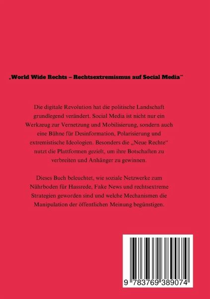 In einer Zeit, in der soziale Medien die politische Landschaft radikal verändern, beleuchtet dieses Buch die beunruhigende Rolle von Plattformen wie Facebook, Instagram, TikTok und Telegram in der Verbreitung rechtsextremistischer Ideologien. Die "Neue Rechte" hat Social Media zu einer mächtigen Waffe gemacht, um Desinformation zu verbreiten, Ängste zu schüren und politische Gegner zu diskreditieren. Das Buch analysiert, wie gezielte Mobilisierungsstrategien, emotionale Manipulation und subtile Influencer-Kommunikation genutzt werden, um extremistische Ideologien zu normalisieren. Es erklärt die psychologischen Mechanismen hinter der Anziehungskraft solcher Ideologien und zeigt auf, wie Algorithmen und Filterblasen diese Dynamik verstärken. Neben der umfassenden Analyse der Problematik bietet das Buch Handlungsempfehlungen: von der Förderung von Medienkompetenz über die Regulierung von Social-Media-Plattformen bis hin zur Zusammenarbeit zwischen Zivilgesellschaft und Technologieunternehmen. Ein unverzichtbarer Leitfaden für alle, die die Herausforderungen der digitalen Meinungsbildung verstehen und aktiv Lösungen finden möchten - ob in der politischen Bildung, Medienwissenschaft oder im persönlichen Engagement gegen Extremismus. Perfekt für Leser:innen, die sich für politische Kommunikation, digitale Medien und die Gefahren von Desinformation interessieren.