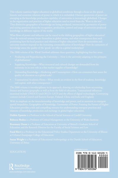 This volume examines higher education in globalized conditions through a focus on the spatial, historic and economic relations of power in which it is embedded. Distinct geometries of power are emerging as the knowledge production capability of universities is increasingly globalized. Changes in the organization and practices of higher education tend to travel from the 'West to the rest'. Thus distinctive geographies of knowledge are being produced, intersected by geometries of power and raising questions about the recognition, production, control and usage of university-produced knowledge in different regions of the world. What flows of power and influence can be traced in the shifting geographies of higher education? How do national systems locate themselves in global arenas, and what consequences does such positioning have for local practices and relations of higher education? How do universities and university workers respond to the increasing commodification of knowledge? How do consumers of knowledge assess the quality of the 'goods' on offer in a global marketplace? The 2008 volume of the World Yearbook addresses these questions, highlighting four key areas: Producing and Reproducing the University- How is the university adapting to the pressures of globalization? Supplying Knowledge-What structural and cultural changes are demanded from the university in its new role as a free market supplier of knowledge? Demanding Knowledge-Marketing and Consumption-How can consumers best assess the quality of education on a global scale? Transnational Academic Flows-What trends are evident in the flow of students, knowledge and capital, with what consequences ? The 2008 volume is interdisciplinary in its approach, drawing on scholarship from accounting, finance and human geography as well as from the field of education. Transnational influences examined include UNESCO and OECD, GATS and the effects of digital technologies. Contrasting contexts include Central and Eastern Europe, Finland, China and India and England. With its emphasis on the interrelationship of knowledge and power, and its attention to emergent spatial inequalities, Geographies of Knowledge, Geometries of Power: Framing the Future of Higher Education provides a rich and compelling resource for understanding emergent practices and relations of knowledge production and exchange in global higher education. Debbie Epstein is a Professor in the School of Social Sciences at Cardiff University Rebecca Boden is a Professor of Critical Management at the University of Wales Institute Rosemary Deem is a Professor of Education at University of Bristol's Graduate School of Education and the Research Director for the Faculty of Social Sciences and Law Fazal Rizvi is a Professor in the Educational Policy Studies Department at the University of Illinois at Urbana-Champaign College of Education Susan Wright is a Professor of Educational Anthropology at the Danish School of Education, University of Århus