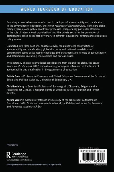 With carefully chosen international contributions from around the globe, the World Yearbook of Education 2021 is ideal reading for anyone interested in the future of accountability and datafication in thegovernance of education.