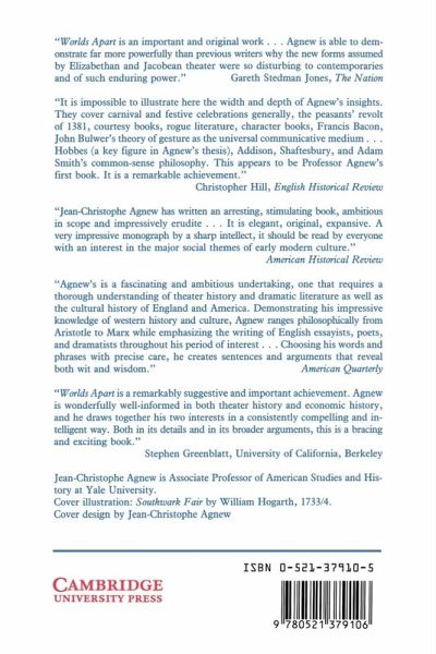 Drawing on a variety of disciplines and documents, Professor Agnew illuminates one of the most fascinating chapters in the formations of Anglo-American market culture. Worlds Apart traces the history of our concepts of the marketplace and the theatre and the ways in which these concepts are bound together. Focusing on Britain and America in the years 1550 to 1750, the book discusses the forms and conventions that structured both commerce and theatre. As marketing practice broke free of its traditional boundaries and restraints, it challenged longstanding popular assumptions about the constituents of value, the nature of identity, the signs of authenticity, and the limits of liability. New exchange relations bred new legal and commercial fictions to authorise them, but they also bred new doubts about the precise grounds upon which the self and its 'interests' were to be represented. Those same doubts, Professor Agnew shows, animated the theatre as well. As actors and playwrights shifted from ecclesiastical and civic drama to professional entertainments, they too devised authenticating fictions, fictions that effectively replicated the bewildering representational confusions of the new 'placeless market'.