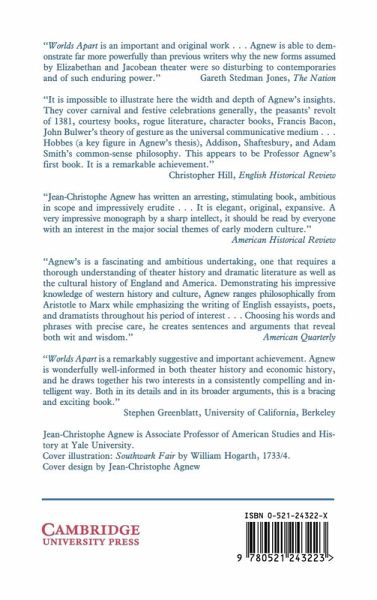 Drawing on a variety of disciplines and documents, Professor Agnew illuminates one of the most fascinating chapters in the formations of Anglo-American market culture. Worlds Apart traces the history of our concepts of the marketplace and the theatre and the ways in which these concepts are bound together.
