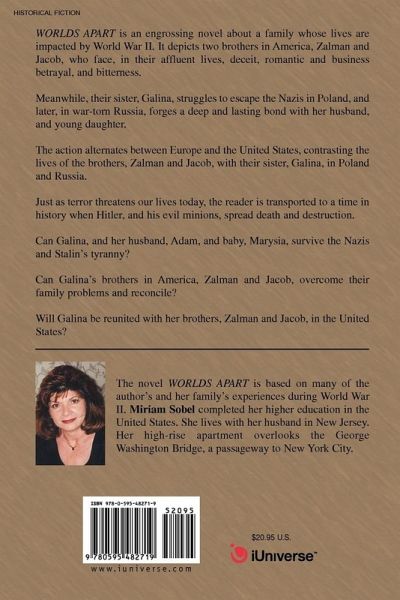 WORLDS APART is an engrossing novel about a family whose lives are impacted by World War II. It depicts two brothers in America, Zalman and Jacob, who face, in their affluent lives, deceit, romantic and business betrayal, and bitterness. Meanwhile, their sister, Galina, struggles to escape the Nazis in Poland, and later, in war-torn Russia, forges a deep and lasting bond with her husband, and young daughter. The action alternates between Europe and the United States, contrasting the lives of the brothers, Zalman and Jacob, with their sister, Galina, in Poland and Russia. Just as terror threatens our lives today, the reader is transported to a time in history when Hitler, and his evil minions, spread death and destruction. Can Galina, and her husband, Adam, and baby, Marysia, survive the Nazis and Stalin's tyranny? Can Galina's brothers in America, Zalman and Jacob, overcome their family problems and reconcile? Will Galina be reunited with her brothers, Zalman and Jacob, in the United States?