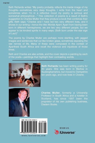 Beth Richards writes: "My poetry probably reflects the inside image of my thoughts-sometimes very deep thoughts. I write from the heart and sometimes when I'm in a reflective mood my poetry is serious and somewhat philosophical." This collection of poems is a result of Beth's suggestion to Charles Muller that they produce a book that combines their gifts. Beth says: "Charles and I have led two very different lives, and it shows in our writing-hence the title Worlds Apart. Apart from having been born in different hemispheres, we are two very different people, but we appear to be kindred spirits in many ways. (Both born under the star sign of Leo!)" The poems by Charles Muller are perhaps more startling, with jagged images and sentences that cut like broken glass, sometimes exposing the raw nerves of life. Many of these were composed in the context of Apartheid South Africa and recall the violence and injustices of those times. Beth and Charles are also artists, and the cover depicts a painting by each of the poet-paintings that highlight their contrasting worlds.