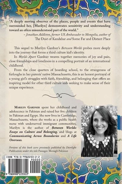This sequel to Marilyn Gardner's Between Worlds probes deeply into the journey that forms a third culture kid's identity. Gardner weaves together memories of joy and pain, close friendships and loneliness in a compelling portrait of an international childhood. From the close quarters of boarding school, to the strangeness of furloughs in her parents' native Massachusetts, Worlds Apart is an honest and moving portrayal of a young girl's struggles with faith, friendship, and belonging. The book offers an inspiring model for other third culture kids seeking to make sense of their unique experience, and the final chapter brings together many practical resources to help TCKs navigate their own journey. "This is a book that shows the complications of a challenging childhood, the healing power of a faithful life, and the precious gifts Third Culture Kids are to the world." Rachel Pieh Jones, from the Foreword "Part spiritual reflection, part childhood reminiscence and part travelogue, Marilyn's book will be especially welcomed by those trying to make sense of their own personal stories, especially if they involve transitions across multiple cultures and geographic locations." Ambassador Jonathan Addleton, author of The Dust of Kandahar and Some Far and Distant Place Worlds Apart incorporates material previously published by Doorlight Publications under the title Passages Through Pakistan.