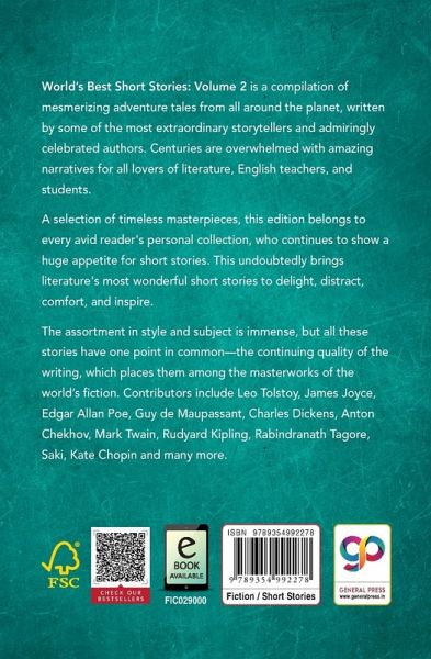 'World's Best Short Stories: Volume 2' is a compilation of mesmerizing adventure tales from all around the planet, written by some of the most extraordinary storytellers and admiringly celebrated authors. Centuries are overwhelmed with amazing narratives for all lovers of literature, English teachers, and students. A selection of timeless masterpieces, this edition belongs to every avid reader's personal collection, who continues to show a huge appetite for short stories. This undoubtedly brings literature's most wonderful short stories to delight, distract, comfort, and inspire. The assortment in style and subject is immense, but all these stories have one point in common-the continuing quality of the writing, which places them among the masterworks of the world's fiction. Contributors include Leo Tolstoy, James Joyce, Edgar Allan Poe, Guy de Maupassant, Charles Dickens, Anton Chekhov, Mark Twain, Rudyard Kipling, Rabindranath Tagore, Saki, Kate Chopin and many more.