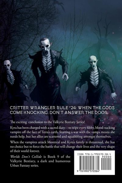 The exciting conclusion to the Valkyrie Bestiary Series! Critter wrangler rule #24: When the gods come knocking, don't answer the door. Kyra has been charged with a sacred duty-to wipe every filthy, blood-sucking vampire off the face of Terra's earth. Starting a war with the vamps means she needs help, but her allies are scattered and squabbling amongst themselves. When the vampires attack Montreal and Kyra's family is threatened, she has no choice but to force the battle that will change their lives and the very shape of their world forever. Worlds Don't Collide is Book 9 of the Valkyrie Bestiary, a dark and humorous Urban Fantasy series.