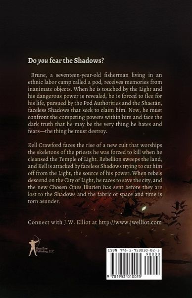 Brune, a seventeen-year-old fisherman living in an ethnic labor camp called a pod, receives memories from inanimate objects. When he is touched by the Light and his dangerous power is revealed, he is forced to flee for his life, pursued by the Pod Authorities and the Shaetán, faceless Shadows that seek to claim him. Now, he must confront the competing powers within him and face the dark truth that he may be the very thing he hates and fears-the thing he must destroy. Kell Crawford faces the rise of a new cult that worships the skeletons of the priests he was forced to kill when he cleansed the Temple of Light. Rebellion sweeps the land, and Kell is attacked by faceless Shadows trying to cut him off from the Light, the source of his power. When rebels descend on the City of Light, he races to save the city and the new Chosen Ones Illurien has sent before they are lost to the Shadows and the fabric of space and time is torn asunder.