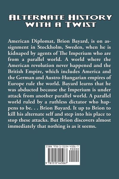 American Diplomat, Brion Bayard, is on assignment in Stockholm, Sweden, when he is kidnaped by agents of The Imperium who are from a parallel world. A world where the American revolution never happened and the British Empire, which includes America and the German and Austro-Hungarian empires of Europe rule the world. Bayard learns that he was abducted because the Imperium is under attack from another parallel world. A parallel world ruled by a ruthless dictator who happens to be. . . Brion Bayard. It up to Brion to kill his alternate self and step into his place to stop these attacks. But Brion discovers almost immediately that nothing is as it seems.