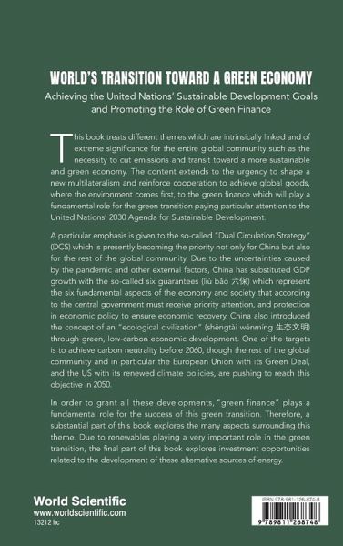 This book treats different themes which are intrinsically linked and of extreme significance for the entire global community such as the necessity to cut emissions and transit toward a more sustainable and green economy. The content extends to the urgency to shape a new multilateralism and reinforce cooperation to achieve global goods, where the environment comes first, to the green finance which will play a fundamental role for the green transition paying particular attention to the United Nations' 2030 Agenda for Sustainable Development. A particular emphasis is given to the so-called "Dual Circulation Strategy" (DCS) which is presently becoming the priority not only for China but also for the rest of the global community. Due to the uncertainties caused by the pandemic and other external factors, China has substituted GDP growth with the so-called six guarantees (liù b¿o ¿¿) which represent the six fundamental aspects of the economy and society that according to the central government must receive priority attention, and protection in economic policy to ensure economic recovery. China also introduced the concept of an "ecological civilization" (sh¿ngtài wénmíng ¿¿¿¿) through green, low-carbon economic development. One of the targets is to achieve carbon neutrality before 2060, though the rest of the global community and in particular the European Union with its Green Deal, and the US with its renewed climate policies, are pushing to reach this objective in 2050. In order to grant all these developments, "green finance" plays a fundamental role for the success of this green transition. Therefore, a substantial part of this book explores the many aspects surrounding this theme. Due to renewables playing a very important role in the green transition, the final part of this book explores investment opportunities related to the development of these alternative sources of energy.