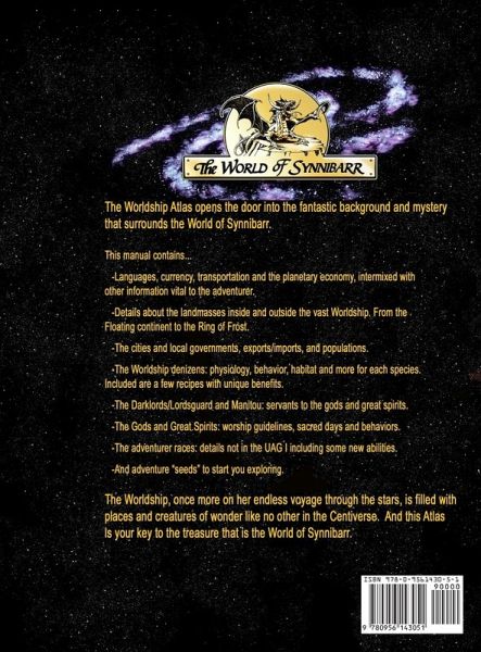 This Worldship Atlas I opens the door into the fantastic background and mystery that surrounds the World of Synnibarr. The Worldship, once more on its endless voyage through the stars, is filled with places and creatures of wonder like no other in the universe. The manual includes...Synnibarr languages, currency, transportation, and the planetary economy, intermixed with other information vital to the adventurer. There are descriptions and information about landmasses inside and outside the vast Worldship, from the mysterious floating continent, the Forbidden Continent, the Ring of Frost, plus many more... The denizens are detailed like never before, their physiology, behavioral characteristics, habitat, physical descriptions, and much more for each species. And then there are the Great Spirits and gods. This new Worldship Atlas gives you an in-depth look of the Worldship Synnibarr, inside and out, like never before.