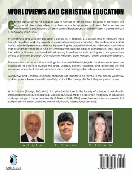 Christ's instruction to his disciples was to witness to others about his plan of salvation. This may be relatively easy when it involves our contemporaries and peers. But when we are working with people from a different cultural background or belief system, it can be difficult or seemingly impossible. In Worldviews and Christian Education, editors W. A. Shipton, E. Coetzee, and R. Takeuchi have brought together works by experts in cross-cultural religious education. The authors and editors have a wealth of personal experience in presenting the gospel to individuals with various worldviews that differ greatly from those held by Christians who take the Bible as authoritative. They focus on the beliefs and issues associated with witnessing to seekers for truth coming from backgrounds as diverse as animism, Buddhism, Confucianism, Hinduism, Islam, Marxism, Taoism, and postmodernism. The emphasis is on educational settings, but the sensitivities highlighted and lessons learned are applicable to situations outside this area. Leaders, pastors, teachers, and laypersons will find valuable conceptual models, practical ideas, and bibliographic references presented here. Worldviews and Christian Education challenges all readers to be faithful to the biblical worldview and to approach everyone with sensitivity, so that, like the apostle Paul, they may reach some.