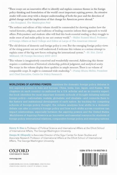 Worldviews of Aspiring Powers provides a serious study of the domestic foreign policy debates in five world powers who have gained more influence as the US's has waned: China, Japan, India, Russia and Iran. Featuring a leading regional scholar for each essay, each essay identifies the most important domestic schools of thought¿nationalists, realists, globalists, idealists/exceptionalists¿and connects them to the historical and institutional sources thatfuel each nation's foreign policy experience. While scholars have applied this approach to US foreign policy, this book is the first to track the competing schools of foreign policy thought within five of the world's most important rising powers. Concise and systematic, This book will serve as both anessential resource for foreign policy scholars trying to understand international power transitions and as a text for courses that focus on the same.