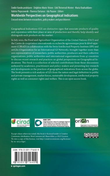 In July 2022, the Food and Agriculture Organization of the United Nations (FAO) and the Centre de coopération internationale en recherche agronomique pour le dével oppement (CIRAD) in collaboration with the Swiss Intellectual Property Institute (IPI) and oriGIn (Organization for an International GI Network), brought together more than 200 representatives of researchers, public authorities, producers and their collective organizations, public authorities and international organizations from 47 countries to discuss recent research and practices on global perspectives on Geographical Indications. This book is a collection of selected contributions from those discussions authored by academics, practitioners and policy-makers and presenting key research and developments in the practices of geographical indications from across the globe. The book presents a rich analysis of GI's from the nature and legal definition to public and private management, market forces, sustainable development, intellectual property rights as well as consumer rights and welfare. This is an open access book.