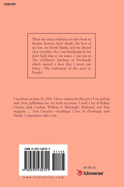There are many references in this book to dreams, heaven, bein' drunk, the love of my lost, my lovely family, and my altered view of reality. Yes, I am handicapped, but don't hold that to my name. I was put in The Children's Institute of Pittsburgh which opened a door that I never saw before-The realization of the good in People!