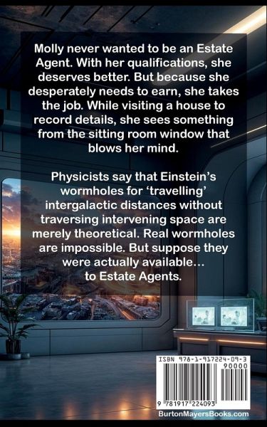 Molly never wanted to be an Estate Agent. With her qualifications, she deserves better. But because she desperately needs to earn, she takes the job. While visiting a house to record details, she sees something from the sitting room window that blows her mind. Physicists say that Einstein's wormholes for 'travelling' intergalactic distances without traversing intervening space are merely theoretical. Real wormholes are impossible. But suppose they were actually available... to Estate Agents.