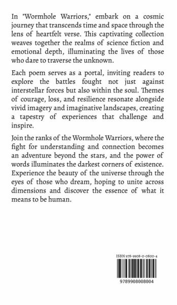 In "Wormhole Warriors," embark on a cosmic journey that transcends time and space through the lens of heartfelt verse. This captivating collection weaves together the realms of science fiction and emotional depth, illuminating the lives of those who dare to traverse the unknown. Each poem serves as a portal, inviting readers to explore the battles fought not just against interstellar forces but also within the soul. Themes of courage, loss, and resilience resonate alongside vivid imagery and imaginative landscapes, creating a tapestry of experiences that challenge and inspire. Join the ranks of the Wormhole Warriors, where the fight for understanding and connection becomes an adventure beyond the stars, and the power of words illuminates the darkest corners of existence. Experience the beauty of the universe through the eyes of those who dream, hoping to unite across dimensions and discover the essence of what it means to be human.