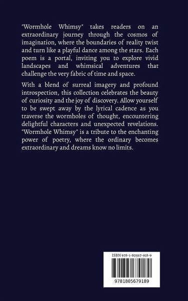 "Wormhole Whimsy" takes readers on an extraordinary journey through the cosmos of imagination, where the boundaries of reality twist and turn like a playful dance among the stars. Each poem is a portal, inviting you to explore vivid landscapes and whimsical adventures that challenge the very fabric of time and space. With a blend of surreal imagery and profound introspection, this collection celebrates the beauty of curiosity and the joy of discovery. Allow yourself to be swept away by the lyrical cadence as you traverse the wormholes of thought, encountering delightful characters and unexpected revelations. "Wormhole Whimsy" is a tribute to the enchanting power of poetry, where the ordinary becomes extraordinary and dreams know no limits.