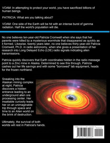 No one believes ten-year-old Patricia Cromwell when she says that her parents were killed by a mysterious wormhole that disappeared as quickly as it formed. Likewise, twenty years later, no one believes thirty-year-old Patricia Cromwell, Ph.D. in radio astronomy, when she gives a presentation of her research into Long Delayed Echo (LDE) radio signals indicating alien transmissions. Patricia quickly discovers that Earth coordinates hidden in the radio message point to a Zinc mine in Alaska. Determined to see this through, Patricia cashes out her life savings and with some "borrowed" lab equipment, heads for the frozen northland. Sneaking into the Alaskan mining complex at night, Patricia discovers a hidden entrance leading to an underground alien ore processing center. Her insatiable curiosity leads her on an unimaginable trip through space and time to an Alien world on the brink of destruction. Ultimately, the alien's actions put the survival of both worlds in Patricia's hands.