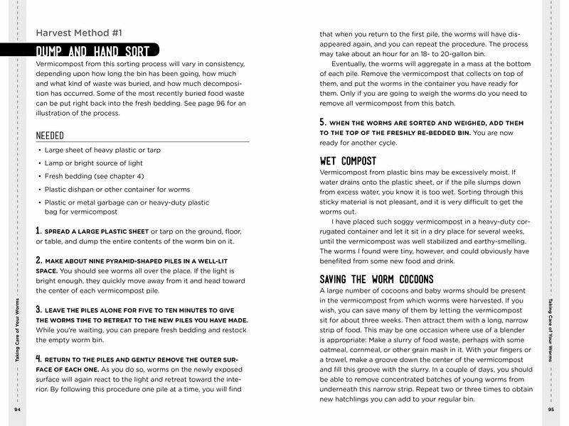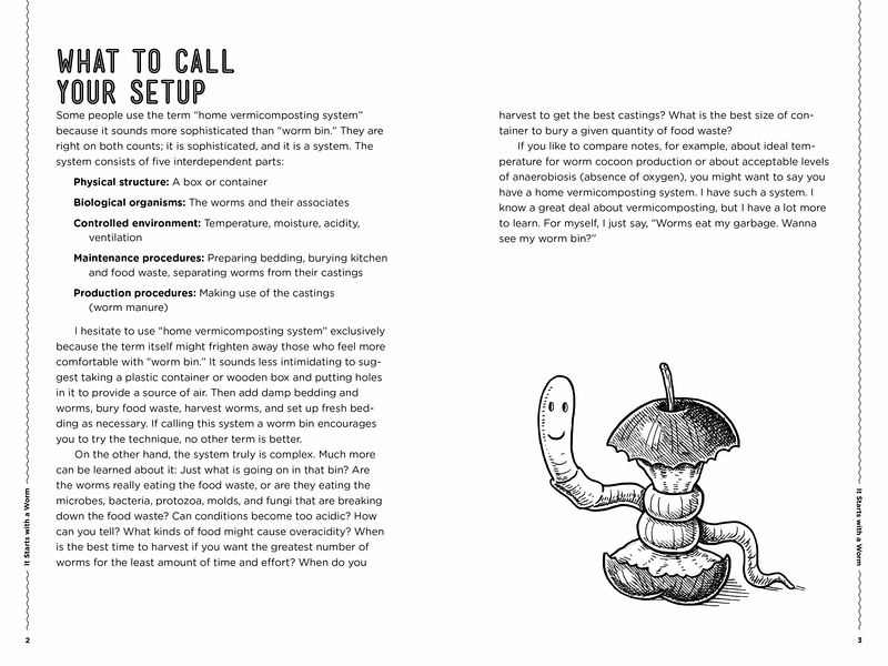 Foreword by Amy Stewart Preface The Worm Composter Checklist 1 It Starts with a Worm 2 Getting Started 3 Choosing the Right Worm Bin 4 Choosing the Right Bedding Material 5 Using the Right Kind of Worms 6 Acquiring Your Worms 7 Setting Up Your Worm Bin 8 What Can Your Worms Eat? 9 Taking Care of Your Worms 10 Frequently Asked Questions 11 Other Critters and Pests 12 How to Use Your Vermicompost 13 Treating Waste as a Resource Appendix A: Record Sheet Appendix B: Annotated References Metric Conversions Appendix C: How Many Worms in an Acre or a Hectare? Glossary Bibliography Acknowledgments Resources Index