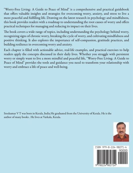 "Worry-Free Living: A Guide to Peace of Mind" is a comprehensive and practical guidebook that offers valuable insights and strategies for overcoming worry, anxiety, and stress to live a more peaceful and fulfilling life. Drawing on the latest research in psychology and mindfulness, this book provides readers with a roadmap to understanding the root causes of worry and offers practical techniques for managing and reducing its impact on their lives. The book covers a wide range of topics, including understanding the psychology behind worry, recognizing signs of chronic worry, breaking the cycle of worry, and cultivating mindfulness and positive thinking. It also explores the importance of self-compassion, gratitude practices, and building resilience in overcoming worry and anxiety. Each chapter is filled with actionable advice, real-life examples, and practical exercises to help readers apply the concepts discussed in their daily lives. Whether you struggle with persistent worry or simply want to live a more mindful and peaceful life, "Worry-Free Living: A Guide to Peace of Mind" provides the tools and guidance you need to transform your relationship with worry and embrace a life of peace and well-being.