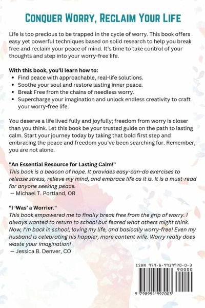 Conquer Worry, Reclaim Your Life Life is too precious to be trapped in the cycle of worry. This book offers easy yet powerful techniques based on solid research to help you break free and reclaim your peace of mind. It's time to take control of your thoughts and step into your worry-free life. With this book, you'll learn how to:Find peace with approachable, real-life solutions. Soothe your soul and restore lasting inner peace. Break Free from the chains of needless worry. Supercharge your imagination and unlock endless creativity to craft your worry-free life. You deserve a life lived fully and joyfully; freedom from worry is closer than you think. Let this book be your trusted guide on the path to lasting calm. Start your journey today by taking that bold first step and embracing the peace and freedom you've been searching for. Remember, you are not alone. "An Essential Resource for Lasting Calm!" This book is a beacon of hope. It provides easy-can-do exercises to release stress, relieve my mind, and embrace life as it is. It is a must-read for anyone seeking peace. - Michael T. Portland, OR "I 'Was' a Worrier." This book empowered me to finally break free from the grip of worry. I always wanted to return to school but feared what others might think. Now, I'm back in school, loving my life, and basically worry-free! Even my husband is celebrating his happier, more content wife. Worry really does waste your imagination! - Jessica B. Denver, CO