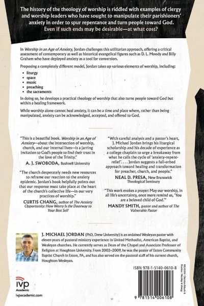 The history of the theology of worship is riddled with examples of clergy and worship leaders who have sought to manipulate their parishioners' anxiety in order to spur repentance and turn people toward God. Even if such ends may be desirable-at what cost? In Worship in an Age of Anxiety, Jordan challenges this utilitarian approach, offering a critical assessment of contemporary as well as historical evangelical figures such as D. L. Moody and Billy Graham who have deployed anxiety as a tool for conversion. Proposing a completely different model, Jordan takes up various elements of worship, including:liturgy space music preaching the sacraments In doing so, he develops a practical theology of worship that also turns people toward God but within a healing framework. While worship alone cannot heal anxiety, it can be a time and place where, rather than being manipulated, anxiety can be acknowledged, accepted, and offered to God.