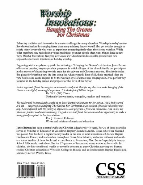 Worship in today's mainline churches is changing faster than many ministry leaders would like, yet not fast enough to satisfy many laypeople who want to experience something fresh when they attend worship. While older members may resist losing valued traditions, younger people often want things done in new ways. Worship Innovations: Hanging The Greens For Christmas finds a middle ground with new approaches to valued traditions of holiday worship. Beginning with a step-by-step guide for initiating a "Hanging the Greens" celebration, Janet Burton offers nine creative, easy-to-produce programs in which all ages of the church family can participate in the process of decorating worship areas for the Advent and Christmas seasons. She also includes five plans for breathing new life into using the Advent wreath. Best of all, these practical ideas are very flexible and easily adapted to fit the worship style of almost any congregation. It's a perfect way to usher in the holiday season and prepare for the birth of the Savior! In this sage book, Janet Burton gives an exhaustive study and ideas for any church to make Hanging of the Greens a worshipful, meaningful experience. It is chock-full of biblical insights. Dr. W.E. (Bill) Thorn Nationally known pastor, evangelist, speaker, and humorist The reader will be immediately caught up in Janet Burton's enthusiasm for her subject. You'll find yourself -- as I did -- caught up in Hanging The Greens For Christmas as an excellent option for innovative worship. I am impressed with the variety of approaches... each program is fresh and innovative. And in this day when our families need much nurturing, it's good to see that Janet Burton has used the opportunity to make a strong family emphasis in her presentations. Rev. J. Kenneth Robinson Writer and minister of music and education Janet Burton has been a pastor's wife and Christian educator for 45 years. For 20 of those years she served as Minister of Education at Woodlawn Baptist Church in Austin, Texas, where her husband was pastor. She has been a regular faculty leader in the area of adult ministries at Glorieta Baptist Conference Center, and in churches throughout Texas, New Mexico, and other midwest and southern states. Author of three books and a contributor to five others, Mrs. Burton's specialty is Sunday School Bible study curriculum. She has 17 quarters of lessons and many articles to her credit. In addition, she has contributed weekly or monthly columns to three Christian newspapers. Burton studied Christian education at Wheaton College in Illinois, and at Southwestern Baptist Theological Seminary in Fort Worth, Texas.
