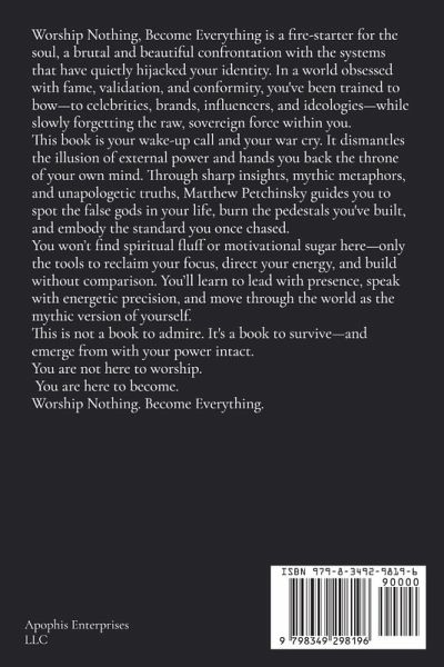 Worship Nothing, Become Everything is a fire-starter for the soul, a brutal and beautiful confrontation with the systems that have quietly hijacked your identity. In a world obsessed with fame, validation, and conformity, you've been trained to bow-to celebrities, brands, influencers, and ideologies-while slowly forgetting the raw, sovereign force within you. This book is your wake-up call and your war cry. It dismantles the illusion of external power and hands you back the throne of your own mind. Through sharp insights, mythic metaphors, and unapologetic truths, Matthew Petchinsky guides you to spot the false gods in your life, burn the pedestals you've built, and embody the standard you once chased. You won't find spiritual fluff or motivational sugar here-only the tools to reclaim your focus, direct your energy, and build without comparison. You'll learn to lead with presence, speak with energetic precision, and move through the world as the mythic version of yourself. This is not a book to admire. It's a book to survive-and emerge from with your power intact. You are not here to worship. You are here to become. Worship Nothing. Become Everything.