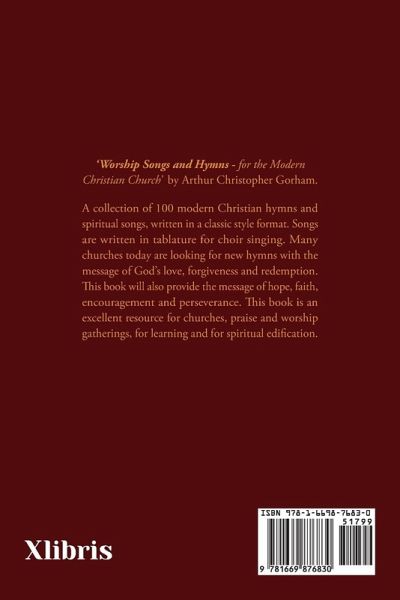 'Worship Songs and Hymns - for the Modern Christian Church' by Arthur Christopher Gorham. A collection of 100 modern Christian hymns and spiritual songs, written in a classic style format. Songs are written in tablature for choir singing. Many churches today are looking for new hymns with the message of God's love, forgiveness and redemption. This book will also provide the message of hope, faith, encouragement and perseverance. This book is an excellent resource for churches, praise and worship gatherings, for learning and for spiritual edification.